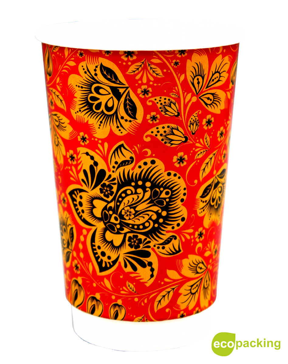 Описание товараДвухслойный бумажный стакан объемом 450мл длдя горячих и холодных напитков с оригинальным,тематическим дизайном "хохлома"