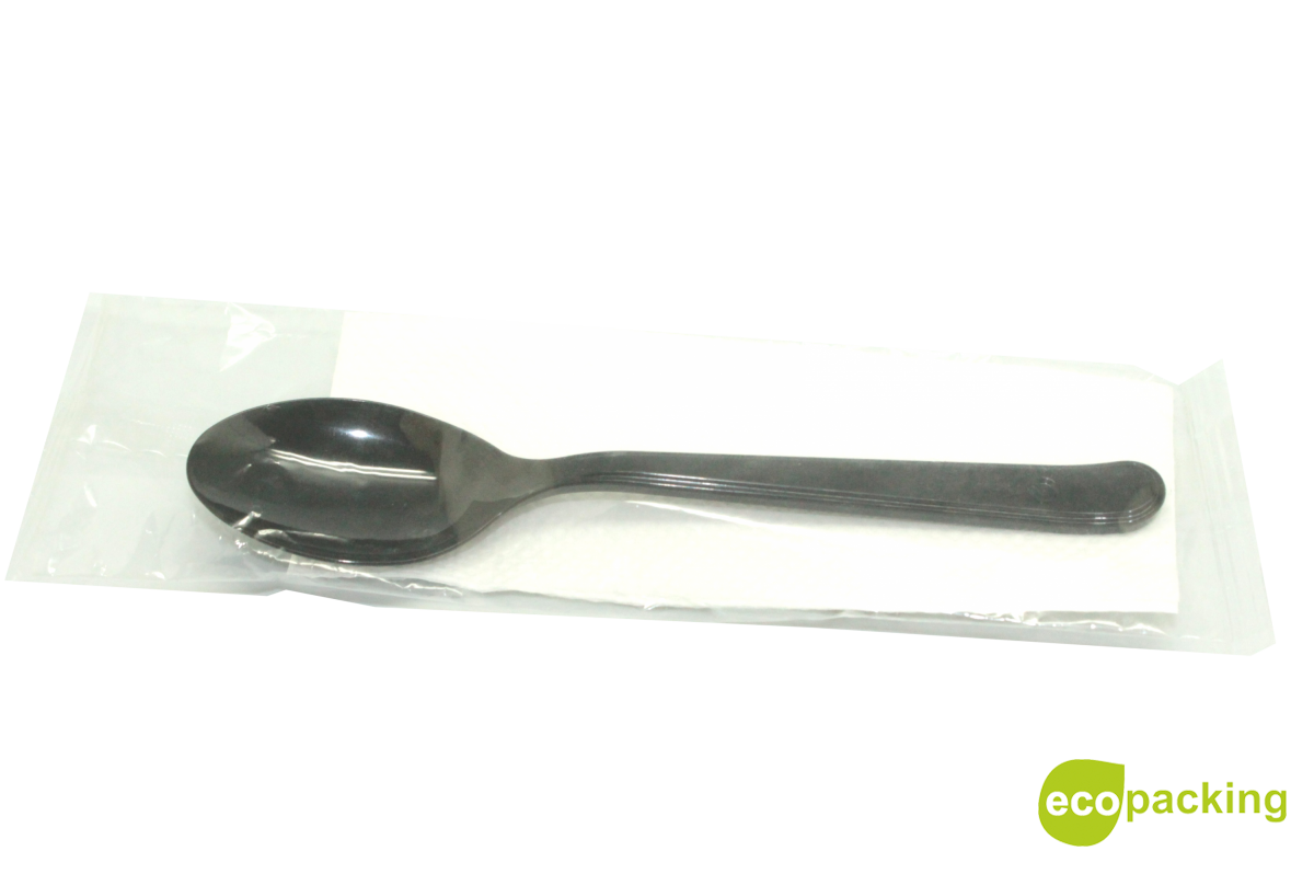 Ложка черная 18 см+салфетка белая большая в индивидуальной упаковке.