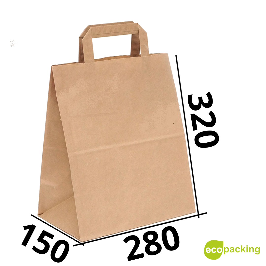 Описание товараБумажный пакет с плоскими ручками из "крафт" бумаги 70 гр./м2 и прямоугольным дном