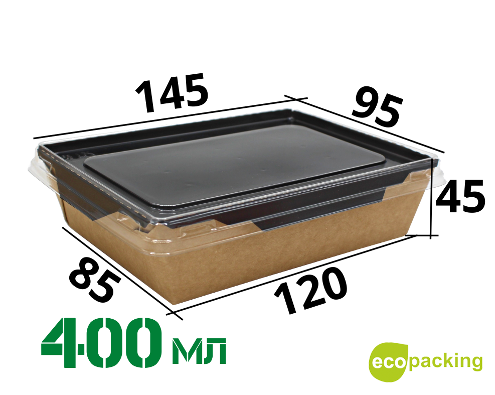 Описание товараБумажный контейнер 400мл с прозрачной крышкой ,ламинированный пленкой черного цвета